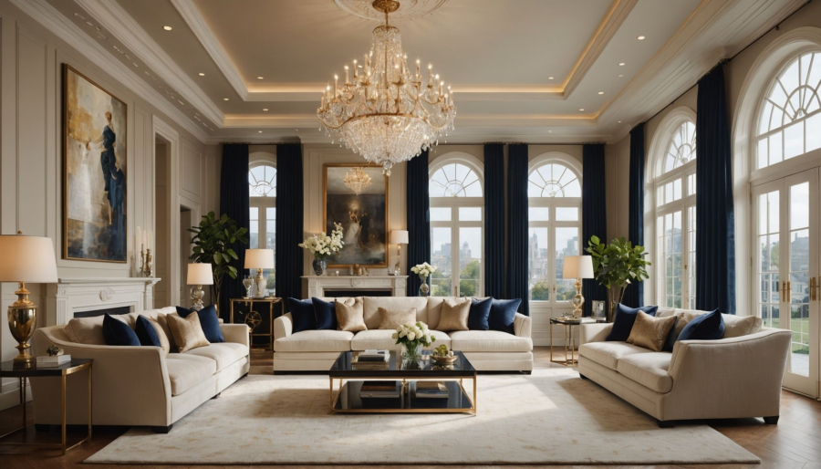 Conseil déco : prévoyez toujours 15 cm de marge supplémentaire pour éviter l'effet écrasant dans votre décoration salon luxe France.